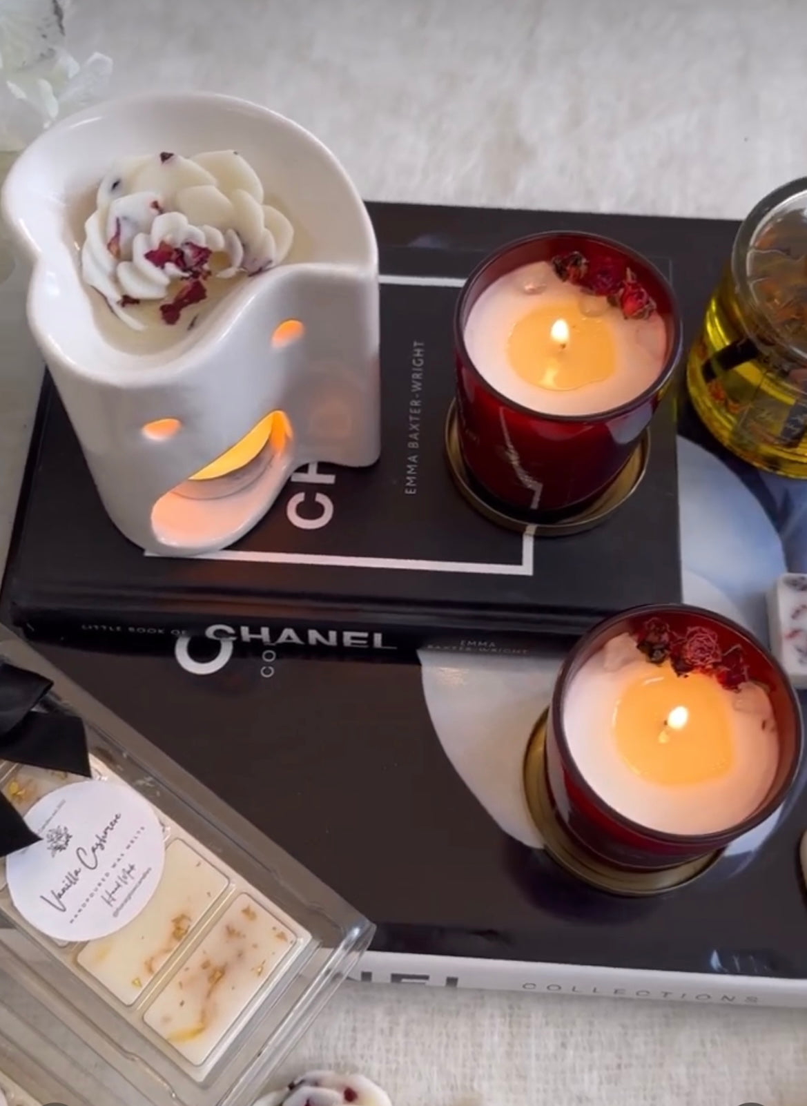 All our candles and wax melts are vegan, non toxic and handmade. They are made with premium plant based soy wax and high quality paraben free fragrance oils.